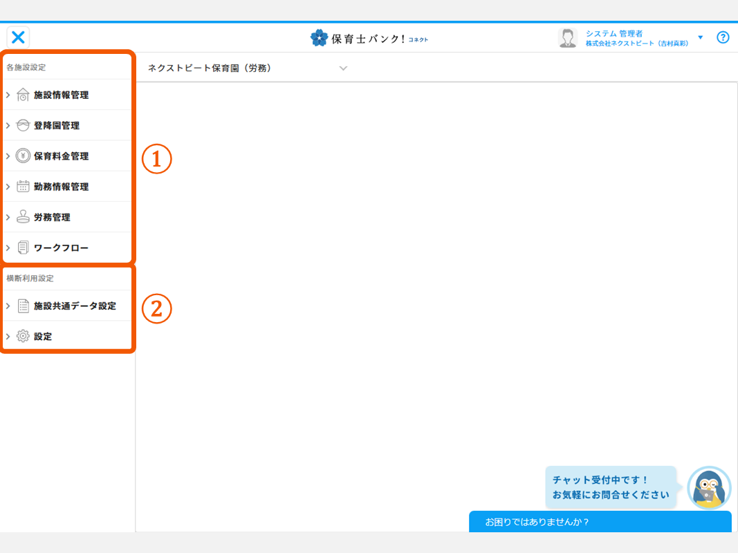 └こちらでは登録されている施設に共通する設定、もしくは横断ツールでの管理者設定が可能です。
