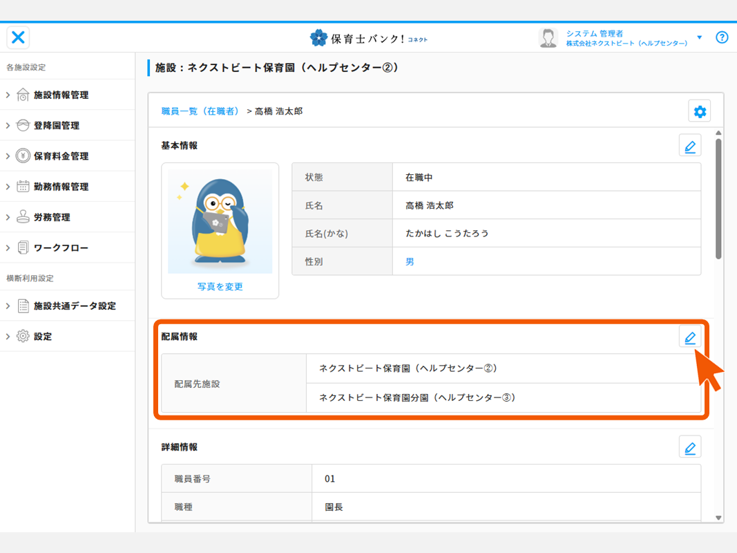 2:配属先情報の【鉛筆マーク】ボタンを押します。