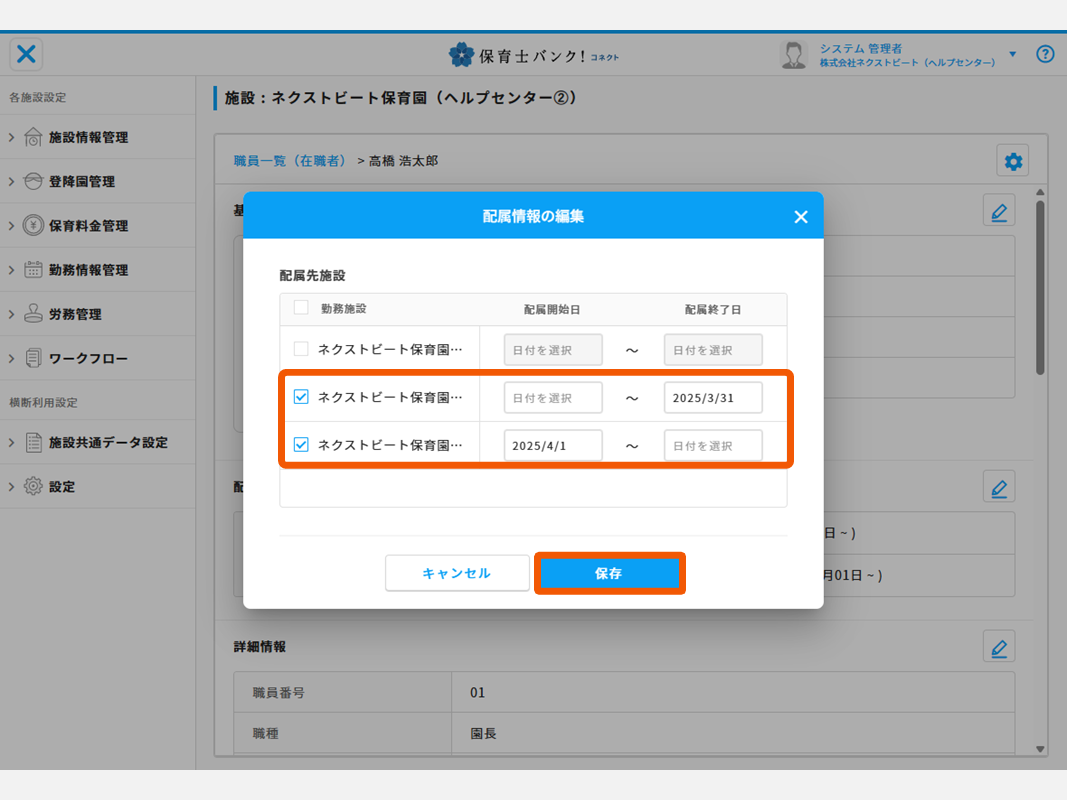 4:異動の場合:新しく勤務する施設を選択し、配属開始日を入れる。現行の施設の配属終了日を入れ、保存ボタンを押します。
