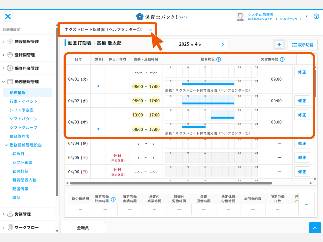 ②兼務職員の勤怠打刻表は複数の段で表示されます。