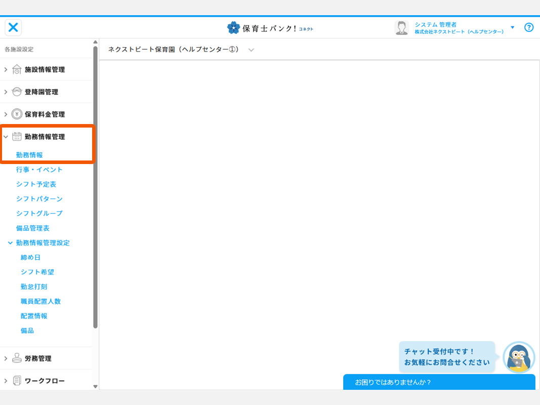 ①「各施設設定」の「勤務情報管理」から、「勤務情報」を開く