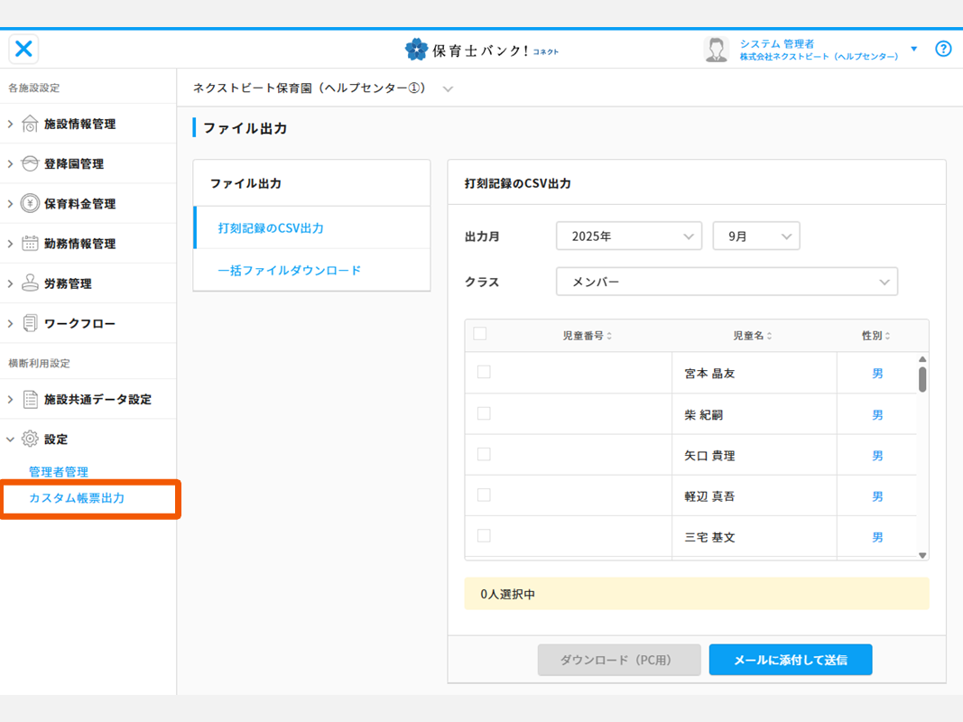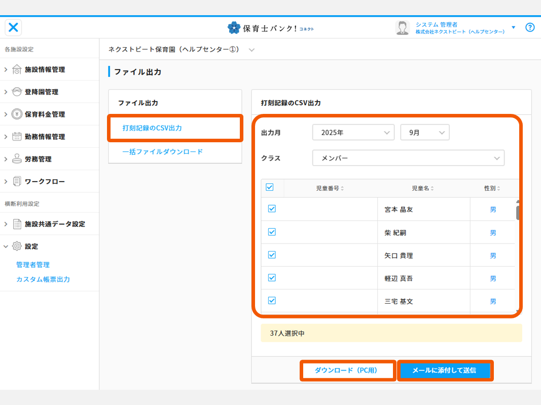 ②「打刻記録のCSV出力」で対象月・クラス・児童を選択し、「ダウンロード(PC用)」もしくは「メールに添付して送信」ボタンを押します。