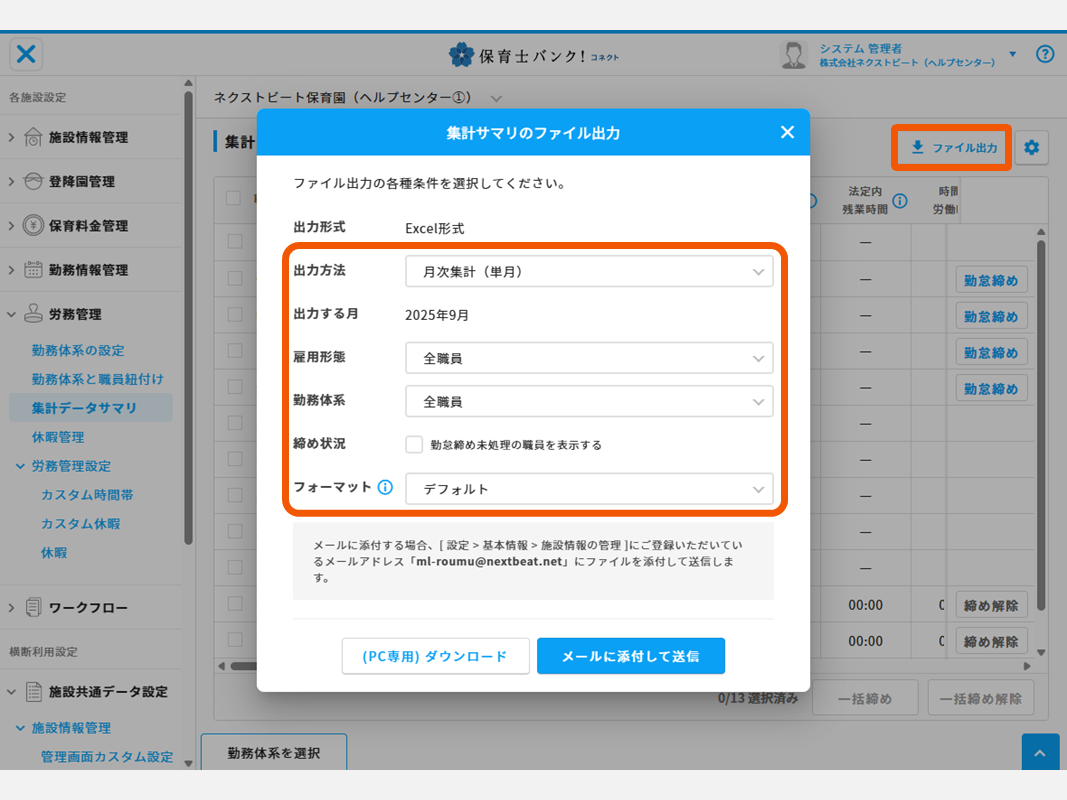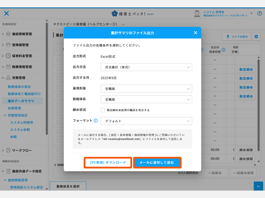 | 月次集計(単月) | 表示されている1ヶ月分のデータを出力します | 「直接ダウンロード」もしくは「メール添付」 |