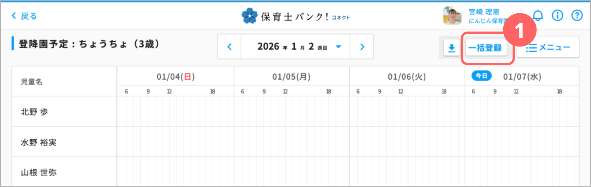 - 登降園管理 > 登降園予定と遷移し、ページ右上の「一括登録」ボタンを押下してください