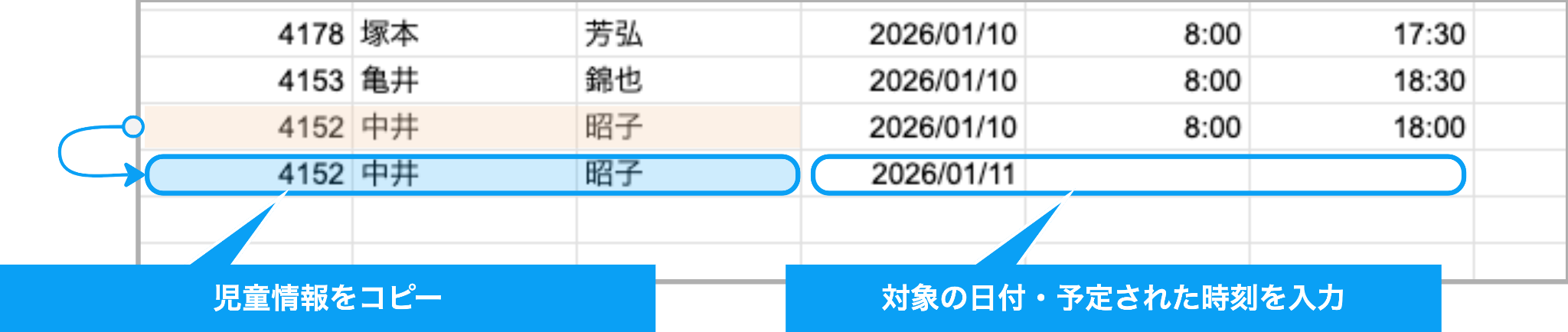 | 管理ID・児童姓名 | 誤った情報を入力するとエラーや誤登録につながるため、同一ファイル内の対象児童の行からコピーして入力してください |