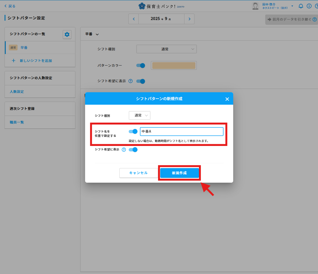 ③「シフト名」を入力し「新規作成」ボタンを押します。