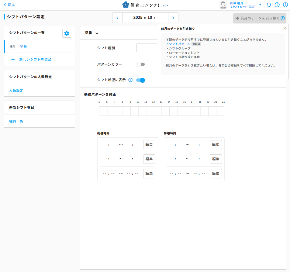 作成したシフトパターンは、翌月以降に引き継ぐことができます。
